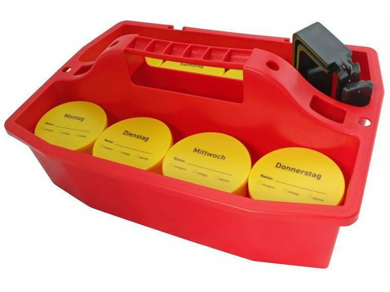Neben dem Wochenplaner sowie den sieben Behältern, gehören auch ein Dosierbecher und ein Löffel mit zum Lieferumfang dazu. Wenn Du möchtest, kannst Du auch gleich unsere praktischen Halterungen mit dazu bestellen, um alles direkt an Deiner Stallbox anhängen zu können. Wie gewohnt, stammt auch dieser Futterplaner aus deutscher Qualitätsfertigung.