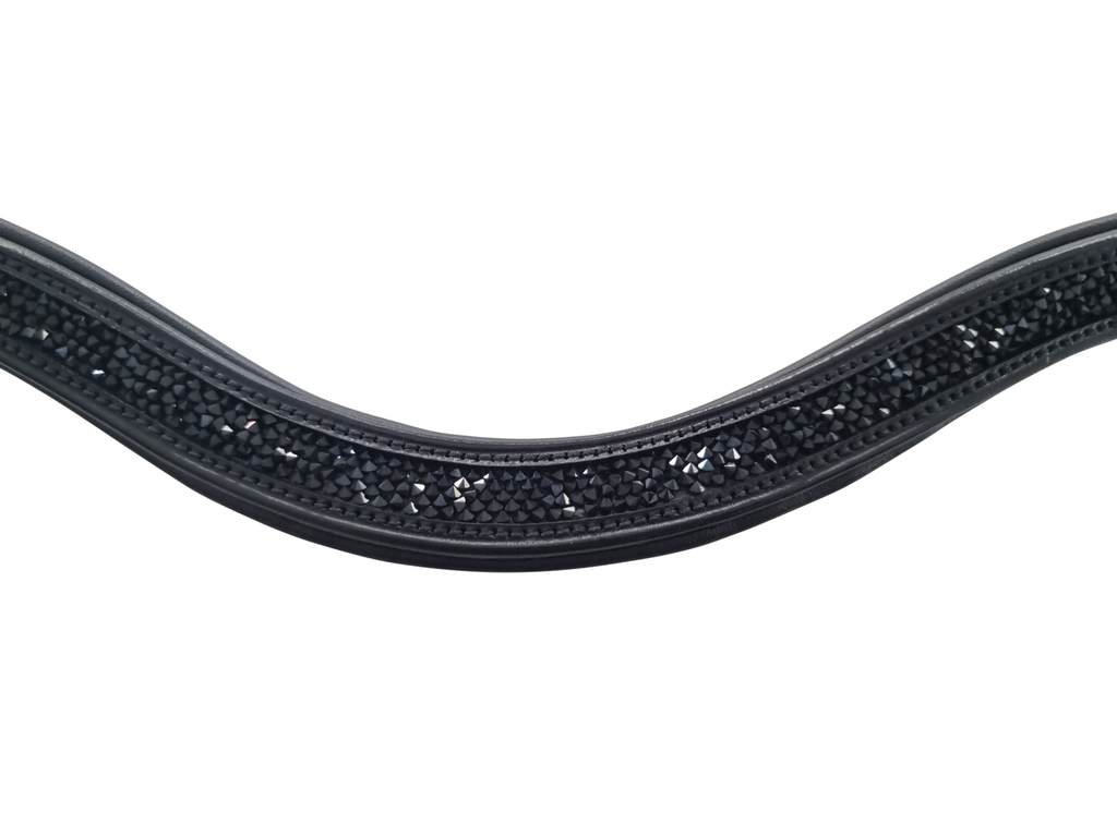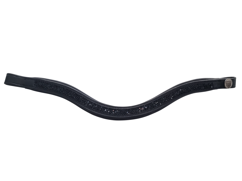 Der stilvoll funkelnde, geschwungene Stirnriemen Black Rocks von Hilbar, wird aus naturgegerbten Leder gefertigt und sichert Deine Royal Exklusiv Trense zuverlässig gegen Verrutschen